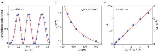 本文正是基于该想法,采用了一种以磁性元素钴掺杂的二维钛氧化物纳米片为代表的宽带隙磁性二维材料做双折射液体的活性材料。所采用的二维材料几何各向异性比(横向尺寸除以厚度)达到了103的量级,高出棒状液晶和一维材料液晶一到两个数量级。由此带来了高双折射率和高各向异性的磁化率。在0~0.2T的磁场驱动范围内,双折射率与磁场强度的平方呈现了完美的线性关系,证实了磁光克顿-穆顿效应(Δn=CλB2)的存在。通过对该线性区间的拟合,得到了C值为1400T-2m-1,高出其他低维材料液晶近两到三个量级。其中所述的0.2T磁场完全可以由两个纽扣大小的永磁体提供,有望全面发挥上面所述磁驱动的优势。此外该二维材料分散液还因具有高透光率,其在正交偏振片下,呈现与磁场一一对应的透射干涉色现象,这是研究人员首次观察到透射干涉色的磁调控现象。为将来透射式颜色领域的诸多新应用打开了大门,如可视化磁传感、透明彩色打印、磁调控滤色膜等。