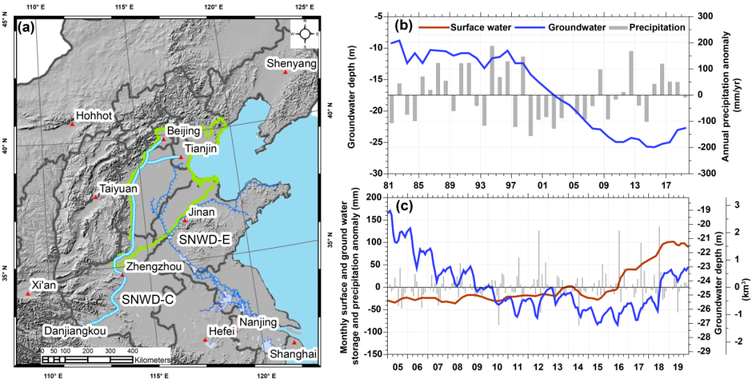 南水北调中、东线示意图和北京1981(2005)‒2019年地下水埋深、地表水及降水变化