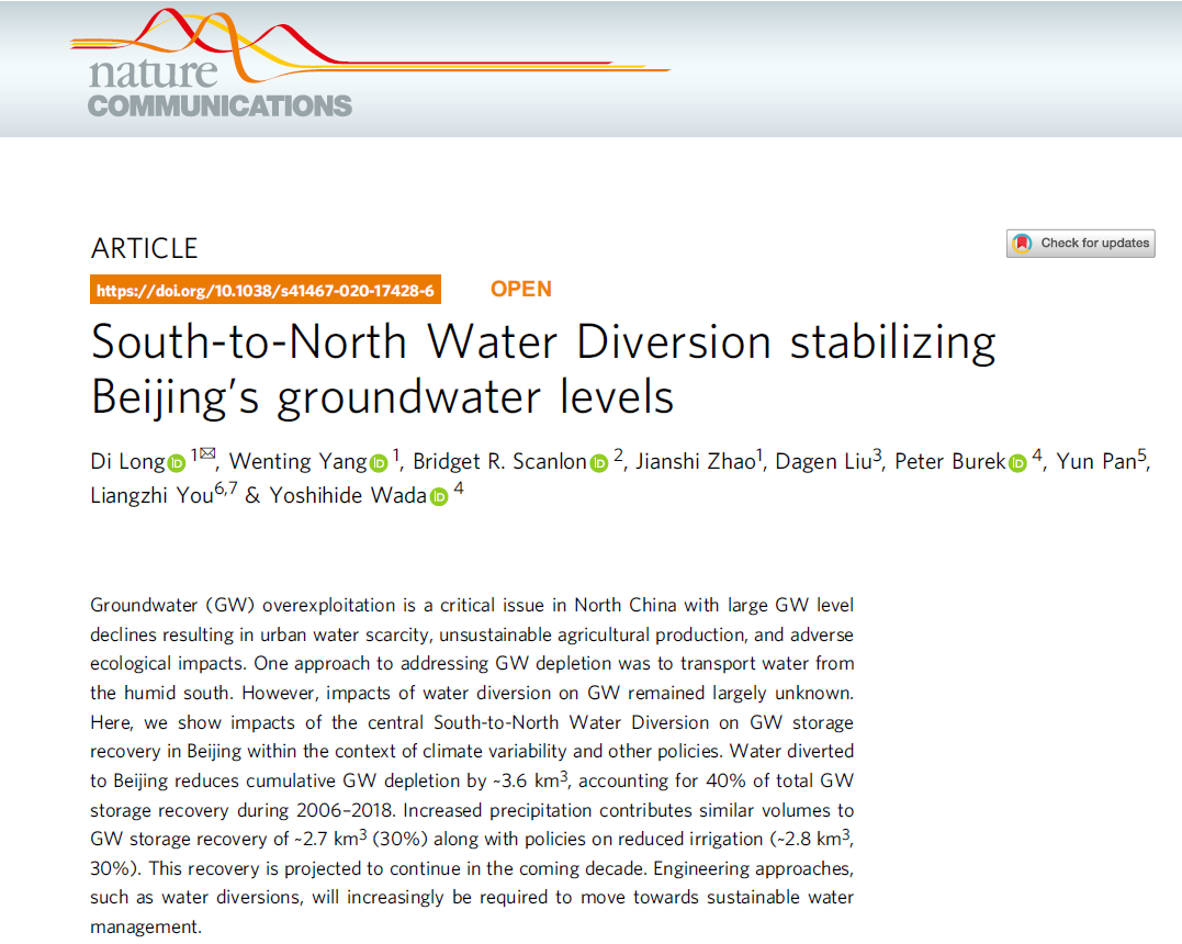 首页网7月28日电 7月21日,心博在线登录入口水利系龙笛研究员、杨文婷博士生、赵建世教授及合作者在国际著名期刊《自然-通讯》(Nature Communications)发表了题为“南水北调使北京地下水位稳定” (South-to-North Water Diversion stabilizing Beijing’s groundwater levels)的研究成果,这是我国水文水资源领域近年来在《自然》子刊发表的为数不多的研究。