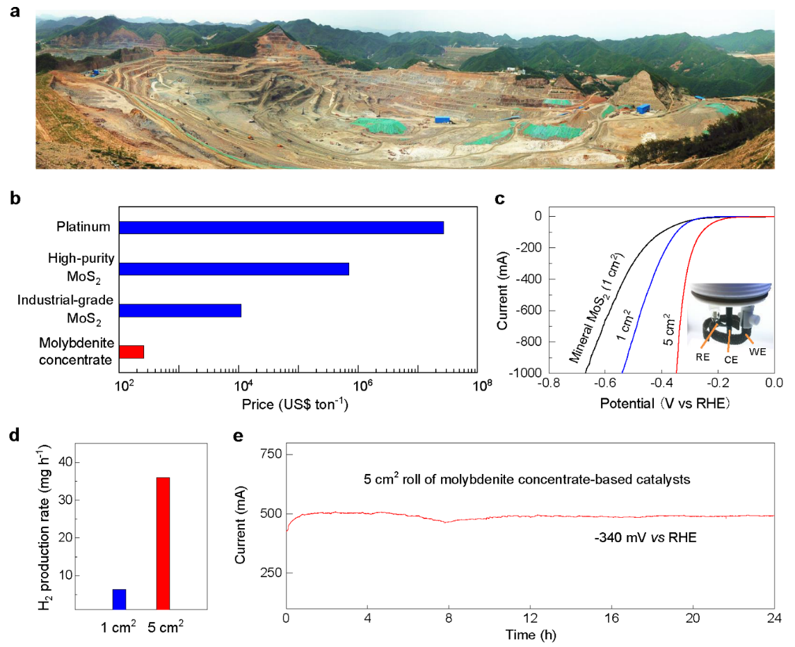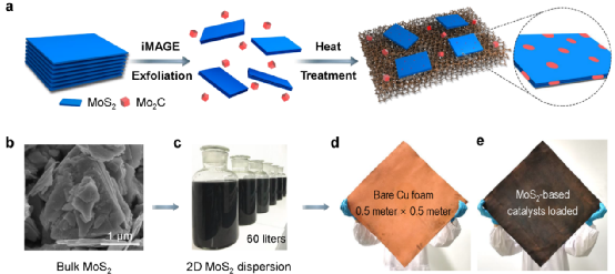 首页网7月29日电 7月24日,清华-伯克利深圳学院刘碧录、成会明团队在《自然·通讯》(NatureCommunications)期刊上在线发表了题为“大规模制备廉价矿物基二维材料大电流产氢电催化剂”(High-Throughput Production of Cheap Mineral-Based Two-Dimensional Electrocatalysts for High-Current-Density Hydrogen Evolution)的研究论文。该研究开发了一种大通量制备二维二硫化钼(MoS2)浆液电催化剂的方法,所制备的二维二硫化钼基电催化剂具有良好的电解水产氢活性,在1Acm-2的大电流密度下所需过电压仅为412mV,并呈现出良好的稳定性。同时,该方法可以拓展至以低成本矿物自然资源为原料来制备电催化剂,是目前已报道制备速率最快、成本最低的方法之一。该工作对二维材料的工业应用以及低成本大储量矿石等自然资源的高附加值应用开发具有较大指导意义。