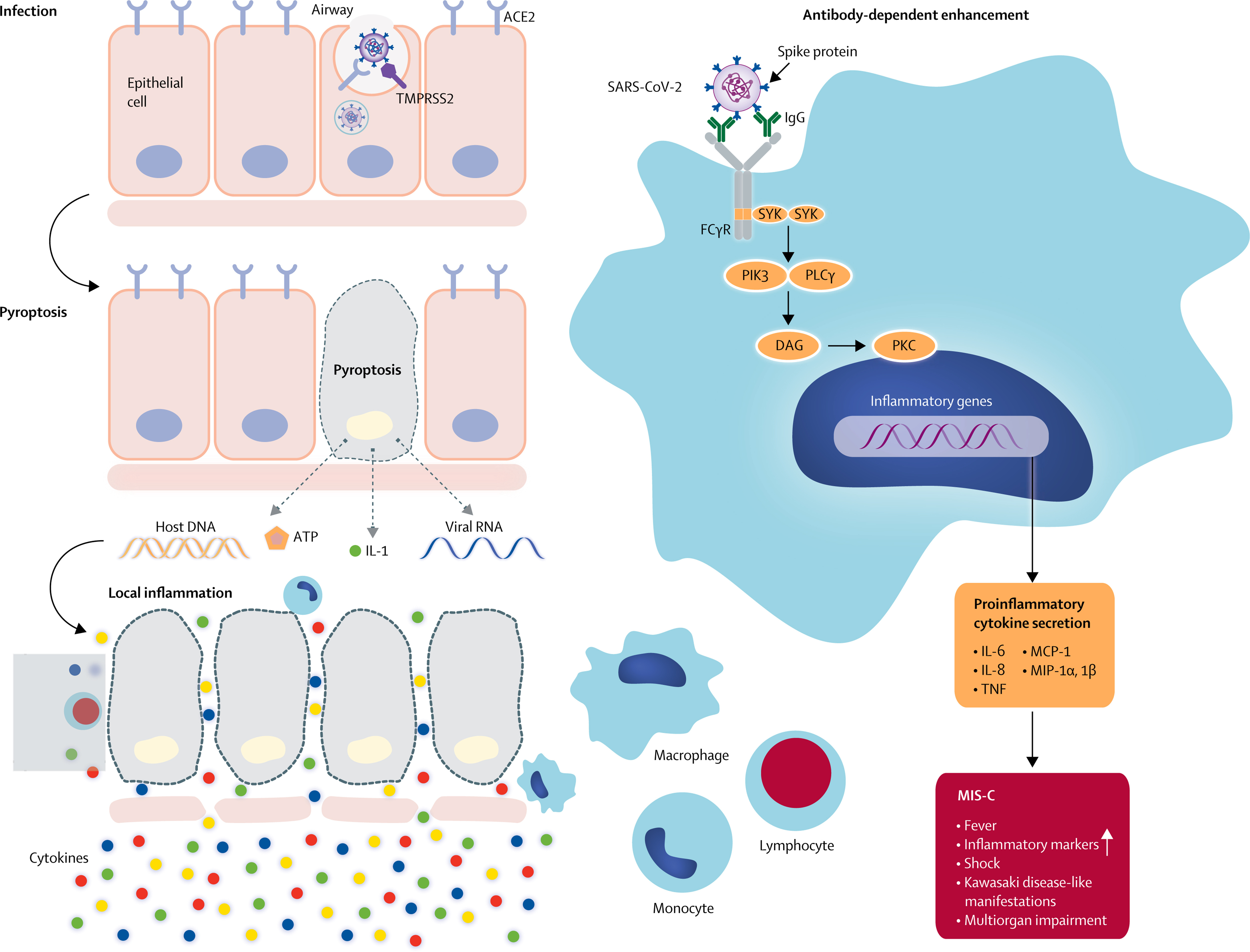 本文回顾了截至2020年7月全球报告的28个MIS-C病例系列研究,总结了MIS-C的流行病学特点和临床特征,并将其与具有类似临床表现的其他儿童常见炎症综合征进行了鉴别比较,后者包括川崎病、川崎病休克综合征及中毒性休克综合征等。文章发现,英国、美国和法国等国报告的儿童多系统炎症综合征都出现在人群感染新冠肺炎病毒高峰期后的一个月左右,且大多数报告的病例都处于既往感染过新冠肺炎的状态,而非正处于急性感染期。MIS-C病例相对于大流行曲线的延迟出现,通过RT-PCR检测出的SARS-CoV-2病毒阳性的病例比例较低,而新冠病毒抗体阳性的病例比例较高,这些特征表明该炎症综合征可能不是由病毒直接侵袭所造成的,而更倾向于与SARS-CoV-2的获得性免疫反应相关。