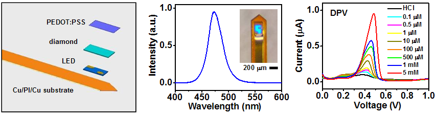 本工作提出了一种基于微型薄膜器件的、无线可植入式、光-电-化学一体化多功能探针(optoelectrochemical probe)的设计思路。利用表面修饰有聚(3,4-乙烯二氧噻吩)-聚苯乙烯磺酸盐(PEDOT:PSS)的金刚石薄膜作为高灵敏度、光学透明、散热性好的电化学传感器,同时采用微型发光二极管(micro-LED)作为植入式光源;设计了一套高效的异质衬底集成工艺,实现了micro-LED和电化学传感器在柔性衬底的堆叠集成,通过对器件封装优化和散热结构设计,获得光-电-化学一体化的多功能植入式探针。同时,开发出与光-电-化学探针相匹配的微型无线控制电路,实现对神经环路的远程光学调控和电化学数据采集。