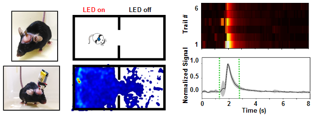 体外实验中,多功能探针的多巴胺检测极限浓度约0.1uM,散热结构设计使micro-LED的表面温升降低50%,满足生物体内实验要求。在实验小鼠的中脑腹侧被盖区(VTA脑区),验证了多功能探针的光遗传学刺激和电化学检测功能。通过无线传输系统可以实现对小鼠行为的远程光遗传调控,改变动物的位置偏好,同时也成功捕捉到了自发的多巴胺神经递质释放信号。在体实验结果显示光-电-化学探针具备远程、实时的光遗传学刺激和电化学检测功能。该研究为探索神经元活动与神经递质释放之间的关系、深入研究神经环路作用机制提供了技术支持。
