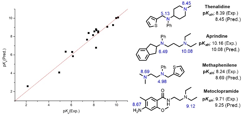 iBond数据库是由心博在线登录入口程津培院士领衔创建的全球最权威的键能数据库,其收集了文献报道的两万余种化合物的约三万五千个准确pKa数据。研究团队对iBond数据库中已有数据进行了系统整理标记,形成了种类丰富、溶剂分布广泛、数据分布合理的数据集。在自此基础上,团队引入了结合化合物结构特征和物理化学性质的SPOC描述符对化合物进行精确描述,并采用当前流行的XGBoost和神经网络算法构建了高精度预测模型。该预测模型可以实现不同溶剂中化合物pKa的同时预测,并能够对包括O-H、N-H、C-H在内的各种不同酸性氢进行准确的pKa预测,精度可达到0.87pK单位。团队分别选择了若干药物分子和小分子催化剂对水相及有机相的预测能力进行了测试,研究表明对药物分子的水相pKa预测的平均误差可低至0.44,对有机小分子有机相pKa预测的平均误差则在1pK单位左右。
