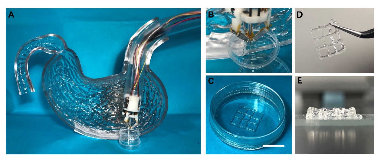 图2 体内原位打印设备 (A)(B)(C)在胃模型中开展原位打印