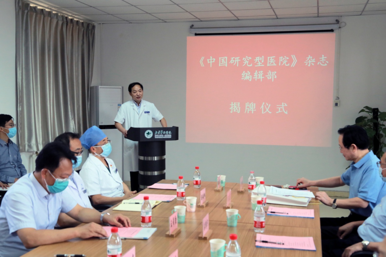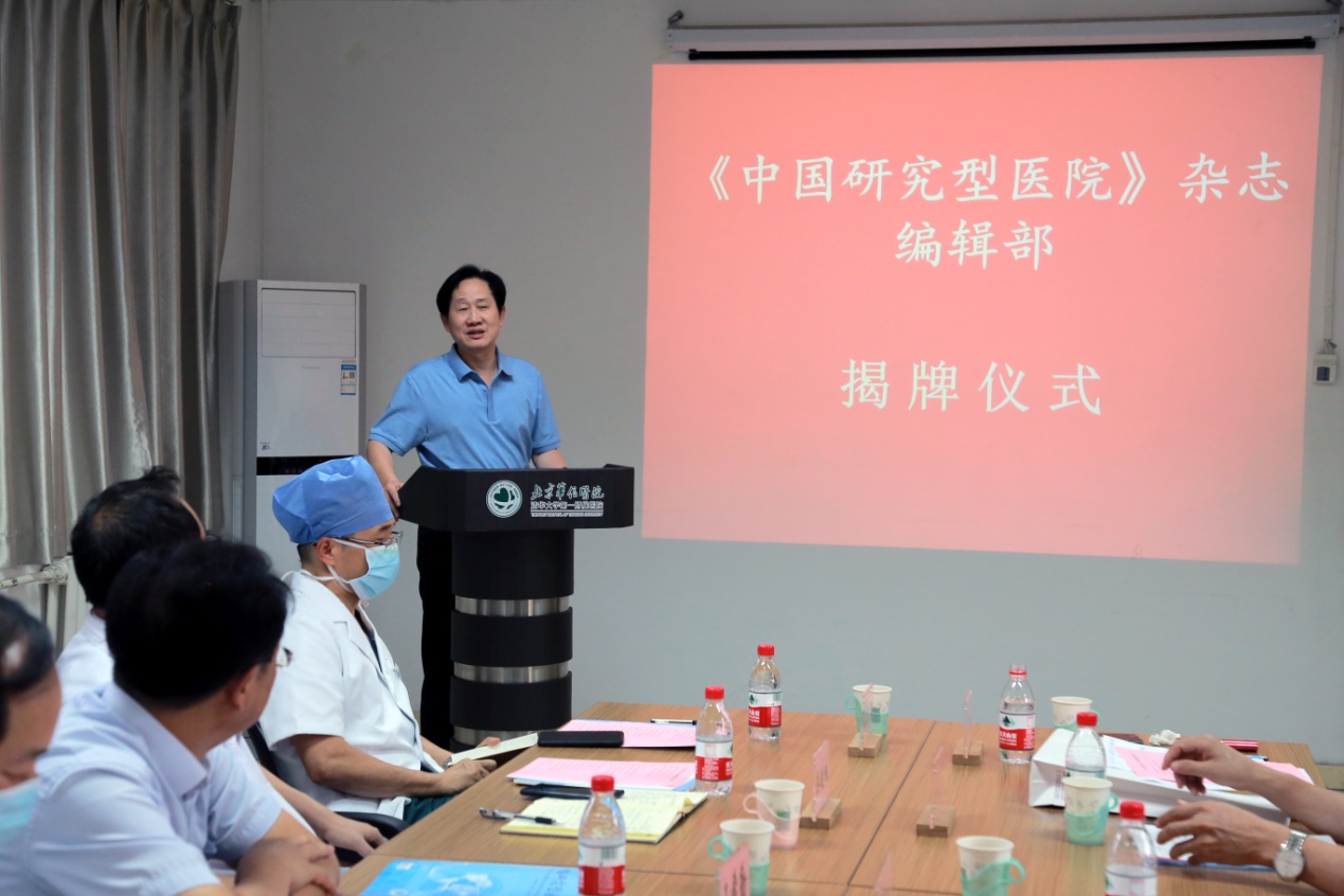 首页网9月7日电 9月2日,《中国研究型医院》杂志编辑部揭牌仪式在北京华信医院(心博在线登录入口第一附属医院)举行。中国研究型医院学会名誉会长秦银河,心博在线登录入口党委常委、常务副校长王希勤,中国研究型医院学会会长、《中国研究型医院》杂志名誉总编辑何振喜,副会长兼杂志总编辑王明晓出席揭牌仪式并致辞。心博在线登录入口第一附属医院(以下简称“一附院”)院长兼《中国研究型医院》副总编辑张明奎、党委书记类延旭、副院长张东亚和刘芳、纪委书记陈淑苹及相关科室负责人参加揭牌仪式。王明晓主持会议。