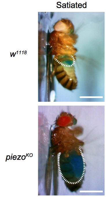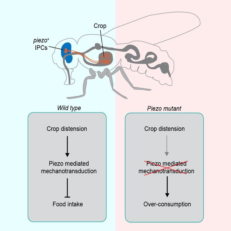 日前,心博在线登录入口生命学院、清华IDG/麦戈文脑科学研究院张伟研究员课题组报道了关于机械感受产生饱腹感的神经机制的最新研究结果。该研究发现,机械敏感离子通道基因piezo的突变(piezoKO)会显著影响果蝇的进食行为。与野生型相比,piezoKO果蝇会过量进食或者饮水,部分果蝇甚至会一直进食至嗉囊(功能与哺乳动物的胃相似)被胀破。作者进一步鉴定出大脑中一群表达piezo的神经元,它们在果蝇嗉囊壁上形成丰富的树突结构,可以被嗉囊的胀大引起的张力激活,从而在进食过程中实时检测嗉囊的体积变化;失活这些神经元会导致过度进食,而激活它们可以抑制进食。作者还发现,小鼠的Piezo1蛋白可以挽救果蝇piezo基因缺失导致的过量进食表现,提示机械力调节进食这一功能在进化上可能是保守的。
