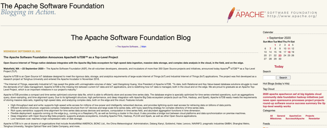 首页网9月28日电 9月23日,美国东部时间上午11时, Apache软件基金会(ASF)宣布Apache®IoTDB™成为Apache顶级项目。Apache IoTDB是首个由中国高校发起并孵化成功的Apache顶级项目。
