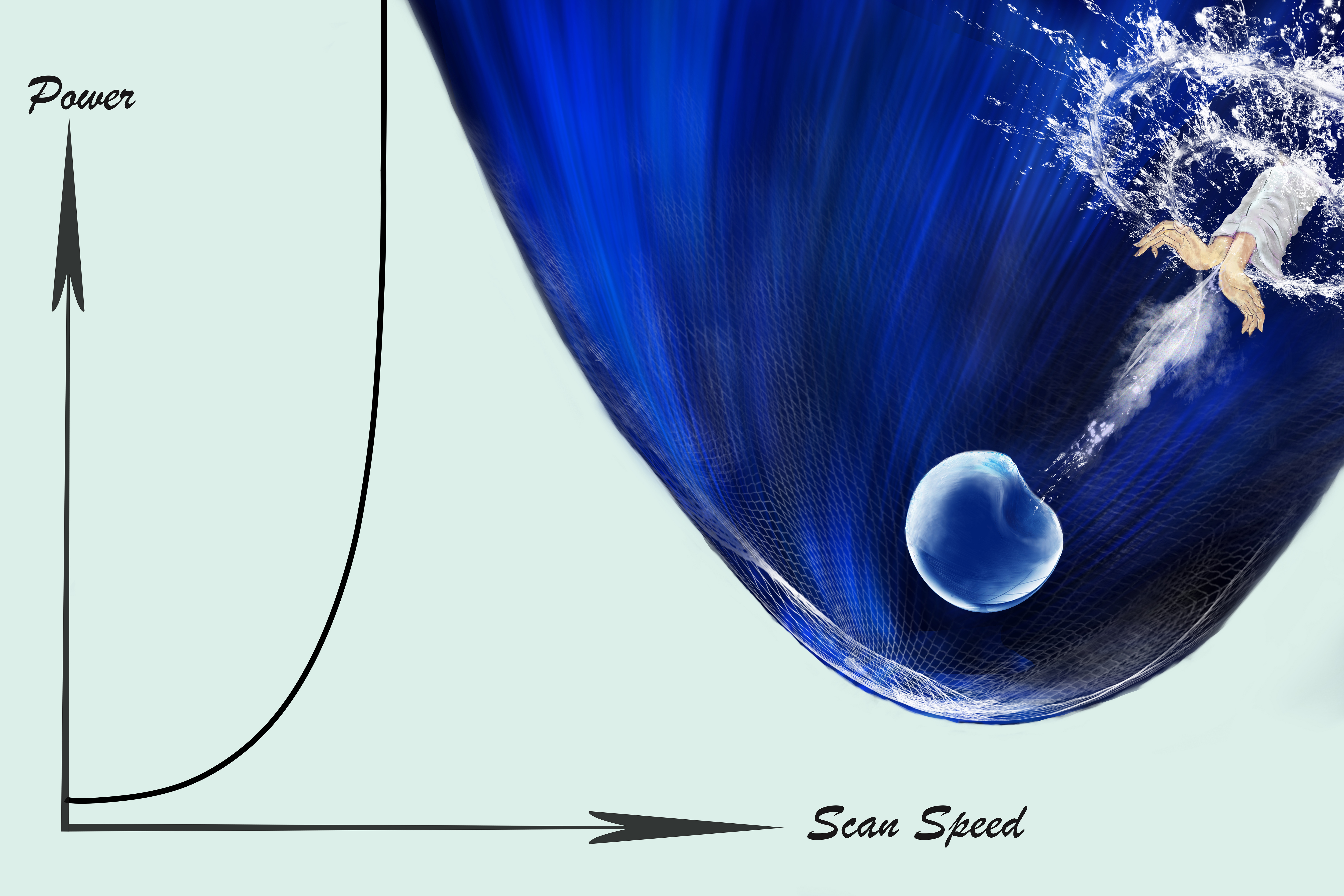关于匙孔气泡区边界和气泡缺陷起源的艺术插图。左侧,在激光功率-扫描速率空间中,匙孔气泡区边界清晰而平滑。右侧,在该边界附近,匙孔根部的临界失稳释放出声波(冲击波),进而驱动气泡快速远离匙孔。当气泡被凝固前端捕捉,便成了缺陷。(插图设计者:心博在线登录入口冯叶;版权所有者:心博在线登录入口赵沧)