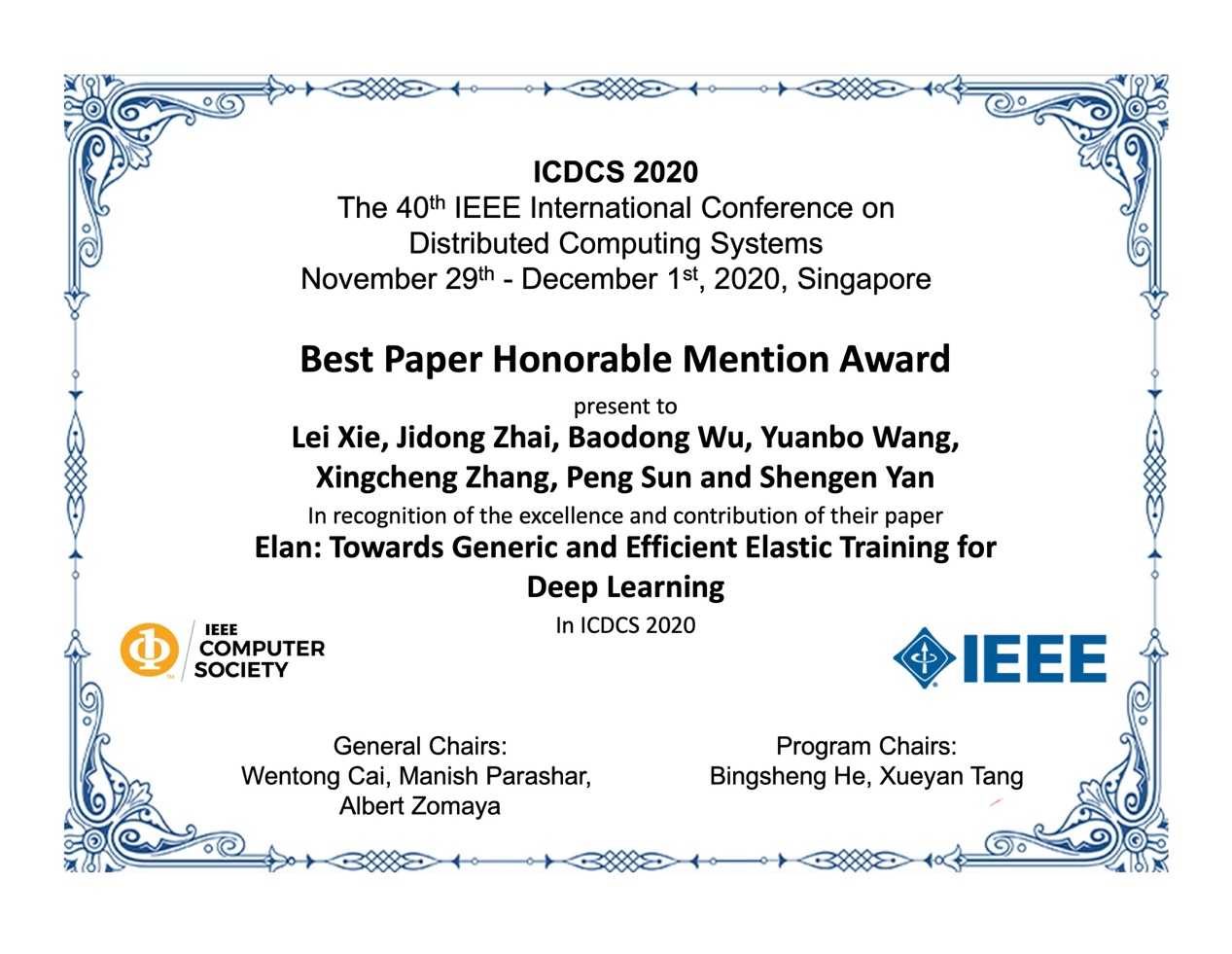 首页网12月3日电 11月29日-12月1日,分布式计算系统国际会议(IEEE ICDCS 2020)在线召开。计算机系师生在大会上作学术报告,高性能所博士生谢磊为第一作者、导师翟季冬为通讯作者发表的论文《高效的弹性深度学习负载训练调度》(Elan: Towards Generic and Efficient Elastic Training for Deep Learning)获得该届会议的最佳论文荣誉奖(Best Paper Honorable Mention Award)。