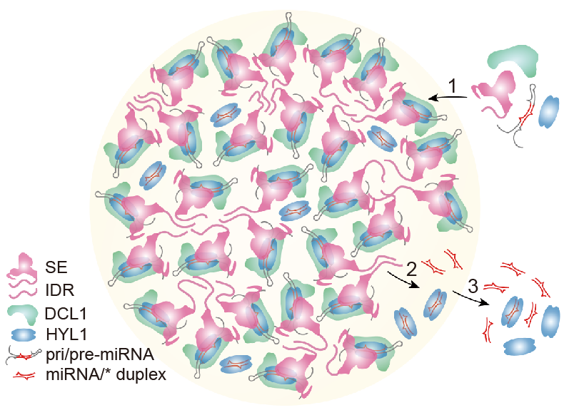 在这项研究中,戚益军研究组首先发现切割小体具有液态的物理属性。通过对切割小体核心组分蛋白的表达纯化和鉴定,发现SE蛋白具有相分离形成液滴的能力,并且这一能力依赖于其N端的一段固有无序区段(IDR)。利用生化和遗传手段,发现SE的液-液相分离驱动了切割小体的形成,并且对高效切割加工pri-miRNA至关重要。进一步研究发现,切割小体是miRNA产生的场所;miRNA在切割小体中产生后,与HYL1结合,从切割小体中释放进而发挥功能。由此,该研究提出了切割小体的组装及作用机制模型:1)SE蛋白通过其N端固有无序区段产生的分子间弱相互作用力而聚集,并招募DCL1、HYL1及前体pri- miRNA,形成切割小体;2)在切割小体中,由于局部浓度的提升,分子间碰撞几率增加,使得DCL1得以高效地切割加工pri-miRNA产生miRNA;3)随着切割过程造成pri-miRNA的消耗,HYL1与SE间的作用力减弱而被释放至切割小体外,由于HYL1具有结合miRNA的能力,向外迁移的HYL携带着miRNA共同转运,从而实现miRNA从切割小体的释放。