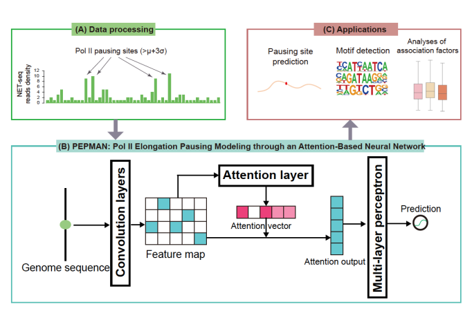 真核生物的转录是一个高度复杂且被准确调控的动态过程,RNA聚合酶II(RNA polymerase II, Pol II)作为转录过程(特别是转录延伸阶段)的核心分子成员,对遗传信息的传递起着关键作用。研究表明,在转录延伸过程中,普遍存在Pol II暂停(Pol II pausing)现象,其参与下游基因的表达调控、影响基因可变剪切的发生,与细胞分化、发育等生命活动息息相关。目前,Pol II暂停相关的转录调控机制研究主要依赖于NET-seq(Native elongating transcript sequencing)等高通量测序技术,成本高、需要一定实验周期。因此,如何实现在全基因组水平上快速、高效的分析Pol II暂停的偏好位点及其序列特征,以及其与相关转录因子间的关系,是转录调控领域亟待解决的技术难点。为了解决这一问题,来自心博在线登录入口的曾坚阳、赵诞团队采用基于注意力机制(attention mechanism)的卷积神经网络对全基因组上的Pol II暂停位点进行预测。在NET-seq数据集上,其预测准确率均显著优于现有机器学习模型。此外,研究组通过分析模型的注意力机制以及分析模型在基因组上特定位点的预测值,进一步探索了Pol II暂停的生物学特征以及和其他转录调控机制的关系,包括:发现了决定Pol II暂停的序列特征以及其与暂停位点的关系;通过分析不同可变剪切方式位点上Pol II的暂停倾向,提供了Pol II影响可变剪切的可能生物学机制;全面分析了Pol II与转录因子、组蛋白修饰、DNA甲基化发生的相关性;发现模型能够很好的弥补测序数据深度不足带来的缺陷。