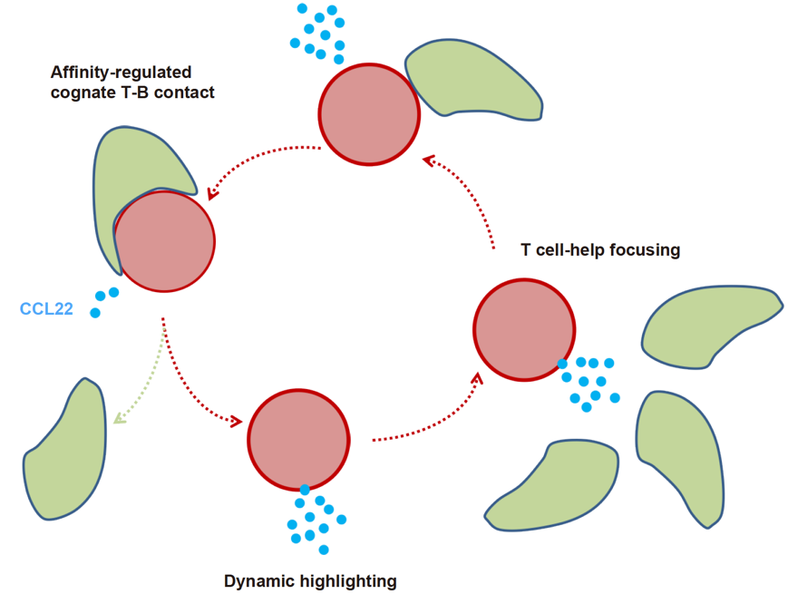 亲和力耦联的CCL22促进生发中心正向选择:T细胞的帮助信号(接触依赖、亲和力耦联)使B细胞上调CCL22,CCL22使这个B细胞可以招募到更多T细胞来光顾,从而更有可能得到来自T细胞的更多帮助信号,而更多帮助信号又使得这些亲和力高的细胞表达更多CCL22,进一步招募T细胞。这一正反馈循环,促进高亲和力抗体的筛选。