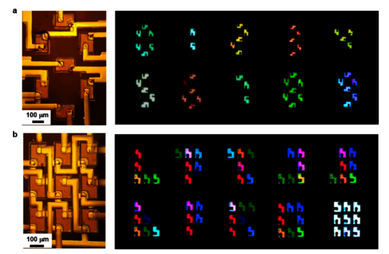 图案化可动态调控的叠层RGB micro-LED显示阵列证明了垂直堆叠结构设计的可行性,这些阵列带有独立的电接触电极,用于LED的可独立控制。该叠层设计策略有望扩展到大规模显示阵列,也可被用来探索其在生物医学等其他领域的应用。