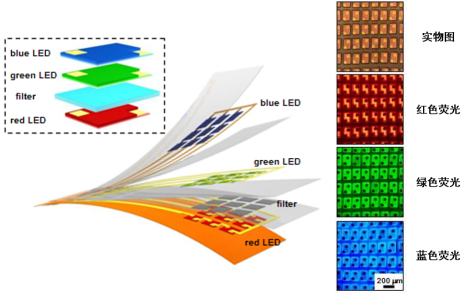 图2.堆叠RGB micro-LED阵列的示意图和实物图