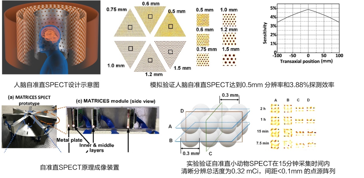 这一思想是SPECT准直基本机理层面的新突破。通过将探测器在三维空间中分离排列形成稀疏阵列,既实现了高空间分辨率准直效果,又避免了光子损失,达到高探测效率,从根本上避免了机械吸收准直造成的空间分辨率和探测效率间的相互制约。研究团队针对人脑成像和小动物成像的模拟实验结果表明:自准直人脑SPECT能够达到0.5mm分辨率和3.88%探测效率;自准直小动物SPECT能够达到0.05mm分辨率和1.25%探测效率。原型成像装置实验结果为:对边缘间距<0.1mm(直径=中心距=0.3mm)的点源阵列,在总活度0.32mCi,成像时间≥15分钟条件下能够清晰分辨。
