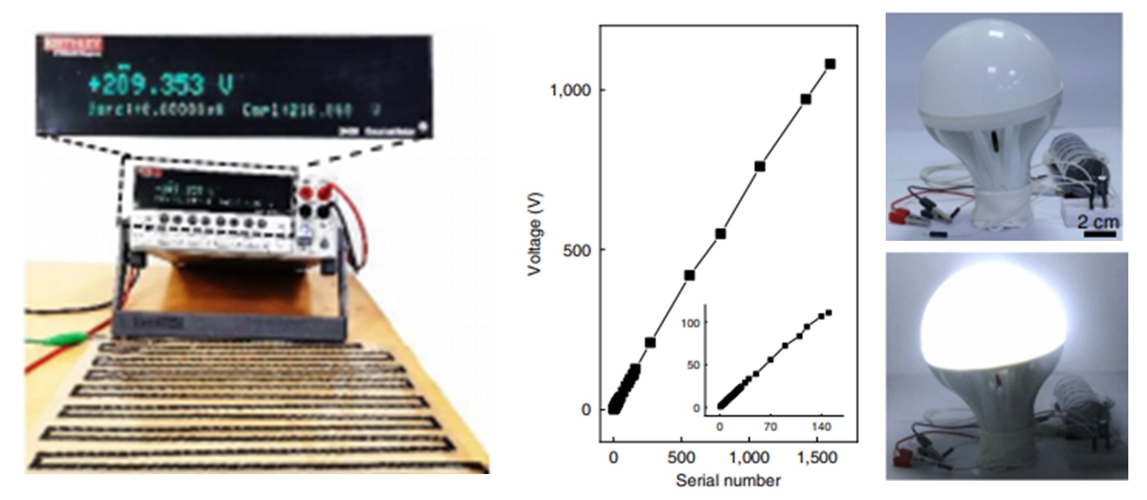 研究人员进一步借助激光加工技术提出了一种错位有序堆叠策略,实现了HMEG的大规模集成。上千个HMEG器件的集成不仅可以实现千伏的电压输出,将产生的电能存储到电容器或电池中,可以给商用电子设备供电(比如10W灯泡和电子墨水屏等),还可以作为栅压驱动场效应晶体管。此外,研究人员还构建了可以高度折叠收缩的HMEG,体积仅为0.5×0.5×9.2cm3的集成器件可以产生高达百伏的电压输出。