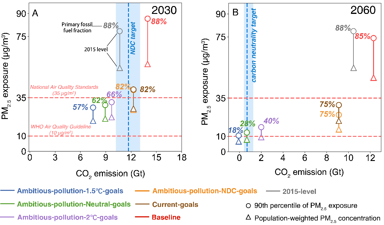在此重大国家战略背景下,心博在线登录入口地学系张强课题组和环境学院贺克斌课题组基于自主研发的中国碳中和与清洁空气协同科学评估与决策支持平台(CNCAP),首次构建了碳达峰与碳中和背景下中国2015至2060年中长期排放情景,提出了全国及重点区域的未来PM2.5污染持续改善路径。研究发现,如一方面加大源头治理力度,提升可再生能源比例,推动钢铁、水泥等高耗能产品产量尽早达峰,加快散煤清洁化替代进程,同时持续推进非电行业、柴油机和VOCs重点行业污染治理工作,则在2030年实现碳达峰目标的同时,全国绝大部分地区PM2.5年均浓度可达到35μg/m3的现行环境空气质量标准,全国人群PM2.5年均暴露水平可从2015年的55μg/m3下降到28μg/m3,实现“减污降碳”的协同效应。