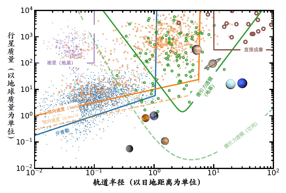 图1. 已知的系外行星的质量-轨道半径分布。不同颜色的点代表不同方法发现的行星:地基望远镜凌星(紫色),开普勒卫星凌星(蓝色),视向速度法(橙色),地基望远镜微引力透镜法(绿色),直接成像法(褐色)。实线表示各方法探测的灵敏区间,绿色的虚线表示未来空间望远镜微引力透镜法的预计探测区间。小图标标识了太阳系八大行星。