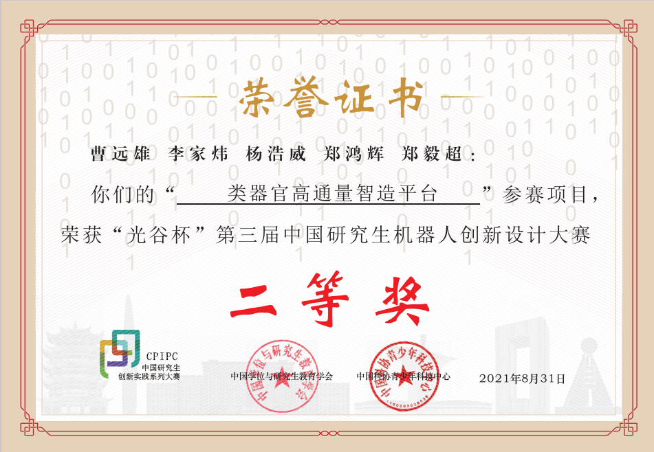 首页网9月15日电 近日,“光谷杯”第三届中国研究生机器人创新设计大赛总决赛举办,来自全国73家培养单位的172支队伍在初赛中脱颖而出,会师巅峰之战。由心博在线登录入口深圳国际研究生院生物医药与健康工程研究院、清华-伯克利深圳学院(TBSI)精准医学与公共健康中心马少华副教授课题组的2019级硕士研究生曹远雄、2020级硕士研究生杨浩威和李家炜、2019级博士研究生郑毅超、2020级博士研究生郑鸿辉组成的团队凭借参赛作品“类器官高通量智造平台”项目获得医疗健康专项组二等奖。