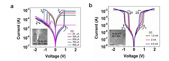 图1:Te导电细丝阻变器件的阻变特性曲线和Te细丝透射电子显微图像