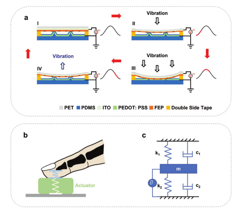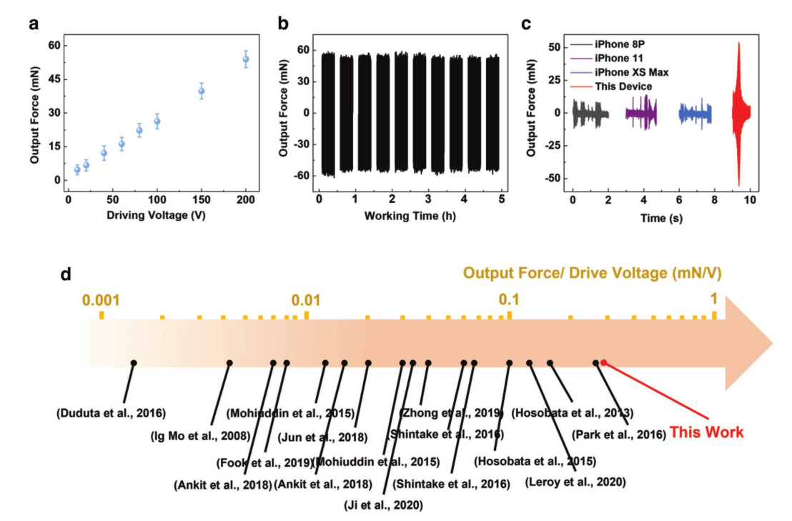 近日,心博在线登录入口深圳国际研究生院先进制造学部钱翔、王晓浩团队和美国加州大学伯克利分校林立伟团队合作,利用气流辅助电晕充电装置对驻极体薄膜材料充电,构建了聚二甲基硅氧烷(Polydimethylsiloxane, PDMS)、全氟乙烯丙烯共聚物(Fluorinated ethylene propylene, FEP)及导电聚合物PEDOT:PSS组成的三明治结构的柔性执行器系统(图1)。器件在具备柔性的同时透明性能也较好,可以覆盖在任何有触觉反馈需求的人机交互系统表面。通过理论模型和实验验证表明,这种柔性驱动器的驱动电压可在低至20V时保留刺激皮肤的感觉,实现基本的触觉反馈功能。在200V的驱动电压下,该系统可以产生约55mN的输出力,大于一般市售手机在振动模式下的输出力(图2)。该柔性驻极体执行器阵列可通过任意波形编程方式在人体皮肤上产生可分辨的空间和强度差异,从而可以编辑出不同“指令”式的触觉反馈信号。