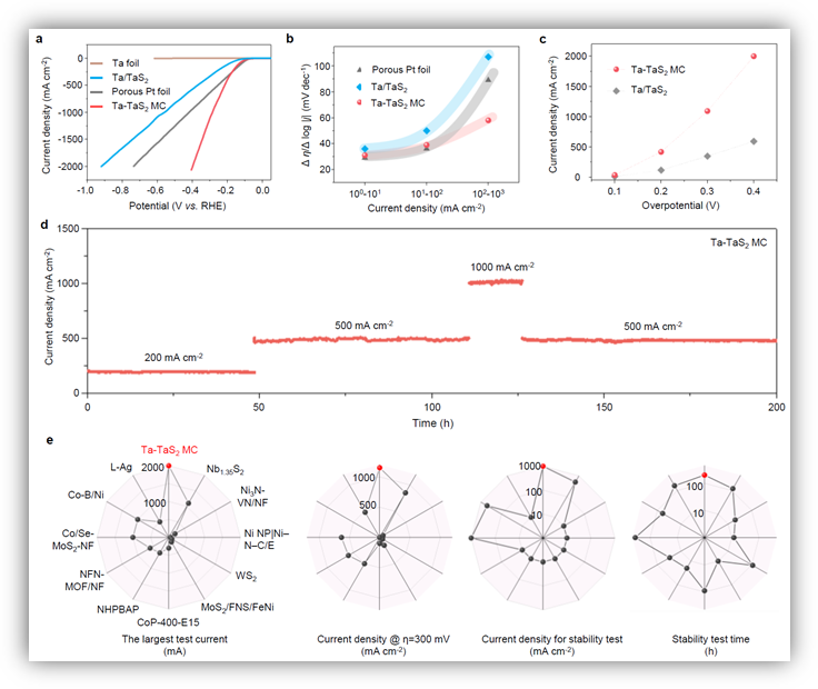 该研究通过一种定向固相合成法从金属基底衍生制备出大面积金属性二维材料电催化剂,金属基底与金属性二维材料共价结合并构建出一个近零电阻界面,该界面的电荷传输快、界面结合力强。第一性原理计算表明,金属基底可向催化剂中有效注入大量电荷,优化氢吸附自由能,提高催化活性;此外,能带结构图解析结果显示,金属基底与金属性二维材料均能在费米能级处贡献大量自由电子,这表明由金属基底与金属性二维材料组合的同源单体析氢电极展现出与金属相同的电学性质,进一步的电学测试结果也验证了这一结论。将该源单体析氢电极直接用于电解水析氢反应,其在2000 mA cm-2的工业大电流密度下仅需398 mV的过电位,优于大多数文献报道结果。此外,该析氢电极在大电流(200 -1000 mA cm-2)工况下持续200小时的析氢反应后性能无衰减,表现出具备工业应用条件的大电流析氢稳定性。进一步的研究表明,以该同源单体析氢电极为阴极、商业氧化铱为阳极组装在电解水器件中,其表现出优于商业铂基析氢电极的电解水性能,仅在1.98 V的施加电压下就实现了1000 mA cm-2的析氢电流密度,法拉第效率接近100%。该同源单体析氢电极制备成本低、催化性能高,在工业电解水制氢电极中具有规模化应用前景。以上研究结果同时为构建电解水制氢电极提供了新思路,相关策略有望进一步拓展到其他应用电极材料体系中。