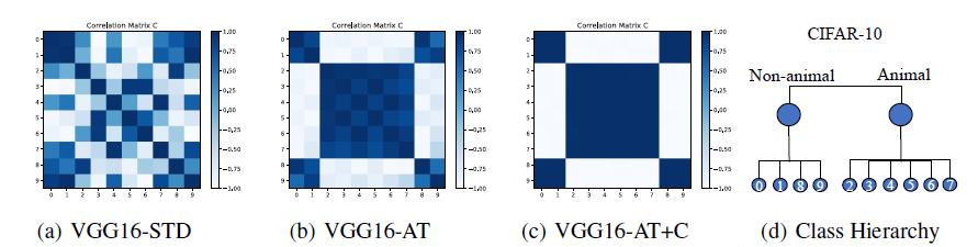 基于CIFAR-10数据集训练的VGG-16模型的关联矩阵图:图(a)“STD”代表非鲁棒模型,图(b)“AT”代表对抗鲁棒模型,图(c)“AT+C”代表运用层级聚类的对抗鲁棒模型, 图(d)展示CIFAR-10数据集的分层标签