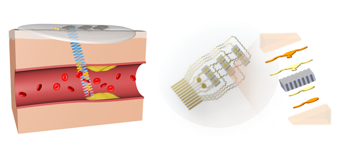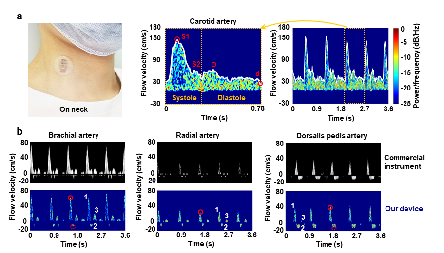 首页网10月29日电 心血管疾病是全球第一大死因,据世界卫生组织预测,到2030年将有约2360万人死于心血管疾病,长期连续监测血流速度对心血管疾病防治具有重要意义。例如,颈动脉在高血压、高血脂等因素作用下往往会出现一定程度的硬化而形成硬化斑块,容易引发脑卒中危险,准确判断管腔狭窄程度是预警斑块脱落和防治脑卒中最重要的方法之一,但当前可持续监测血管狭窄状况的技术手段十分缺乏。基于光容积描记术或热分析的技术只能提供相对的流量变化,探测深度很浅;而传统的超声设备体积大、材质刚性,存在固定困难、接触变形大、无法与人体表面良好耦合和难以连续监测等缺点。