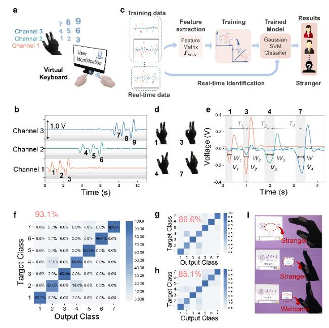 通过提取和分析以上多维信号特征,不同维度的人机交互得以实现,包括智能家居(如灯光控制)、机械手控制以及可实现用户识别的虚拟键盘(其识别准确率可达93.1%)。独特的基于跨阻放大器的信号调理电路消除了多通道信号实时传输中的大部分串扰及噪声,增强了系统的鲁棒性。该工作为开发多维人机交互提供了新思路,在未来人机交互应用中有巨大潜力。