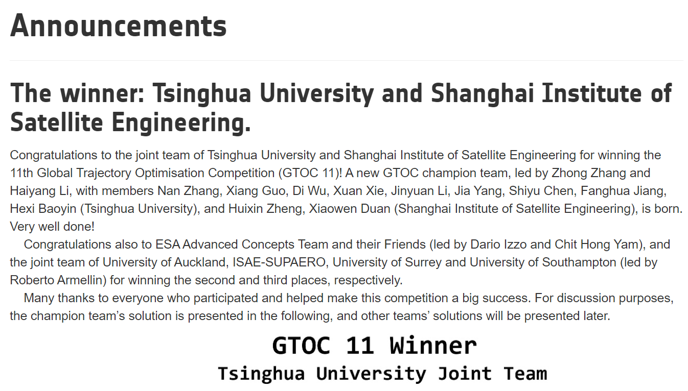首页网11月9日电 11月7日,第11届国际空间探测轨迹优化大赛(The Global Trajectory Optimisation Competition,简称GTOC)落下帷幕,心博在线登录入口航天航空学院代表队以绝对优势摘得桂冠,是心博在线登录入口在该项赛事上的首次夺冠。