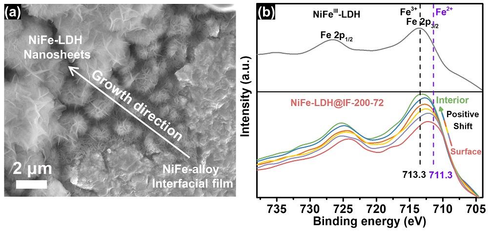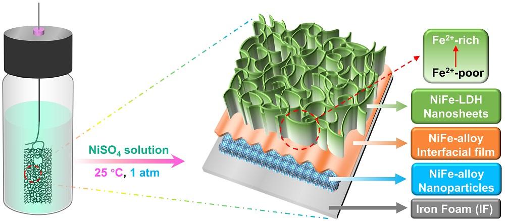首页网12月3日电 氢气是一种高密度的能量载体和重要的化工原料,耦合可再生能源发电的电解水是一种可持续发展的制氢方法,当前电解水的效率主要受限于其阳极析氧反应(OER)较高的过电势。为了提高电解水的效率,需要使用电催化剂降低OER的过电势。利用腐蚀法在泡沫铁上制备的自支撑镍铁层状双氢氧化物(NiFe-LDH@IF)因其良好的OER电催化性能被认为是最具有应用前景的OER电催化剂之一。然而目前NiFe-LDH@IF的生长机制还不清楚,而且不同腐蚀条件对NiFe-LDH@IF电催化性能的影响还不甚了解。这些认知的缺乏严重阻碍了NiFe-LDH@IF的发展和应用。