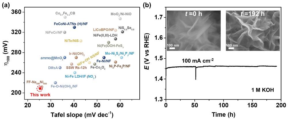 为了提高NiFe-LDH@IF的表观活性,一方面需要促进NiFe-LDH的生长并提高其中Fe2+掺杂浓度,另一方面需要抑制FeOOH的生长,因此腐蚀时间和NiSO4溶液浓度均要适当,不能太高也不能太低。本研究探索出的最佳的NiSO4溶液浓度为200mmol L-1,最佳腐蚀时间为72小时。优化腐蚀条件制备的NiFe-LDH@IF与文献中报道的其他高性能OER催化剂相比具有更低的过电势和更小的塔菲尔斜率。此外它还表现出了优异的电催化稳定性,在100mAcm-2的电流密度下能够稳定运行192h,稳定性测试前后的NiFe-LDH纳米片的形貌几乎没有变化(图4)。