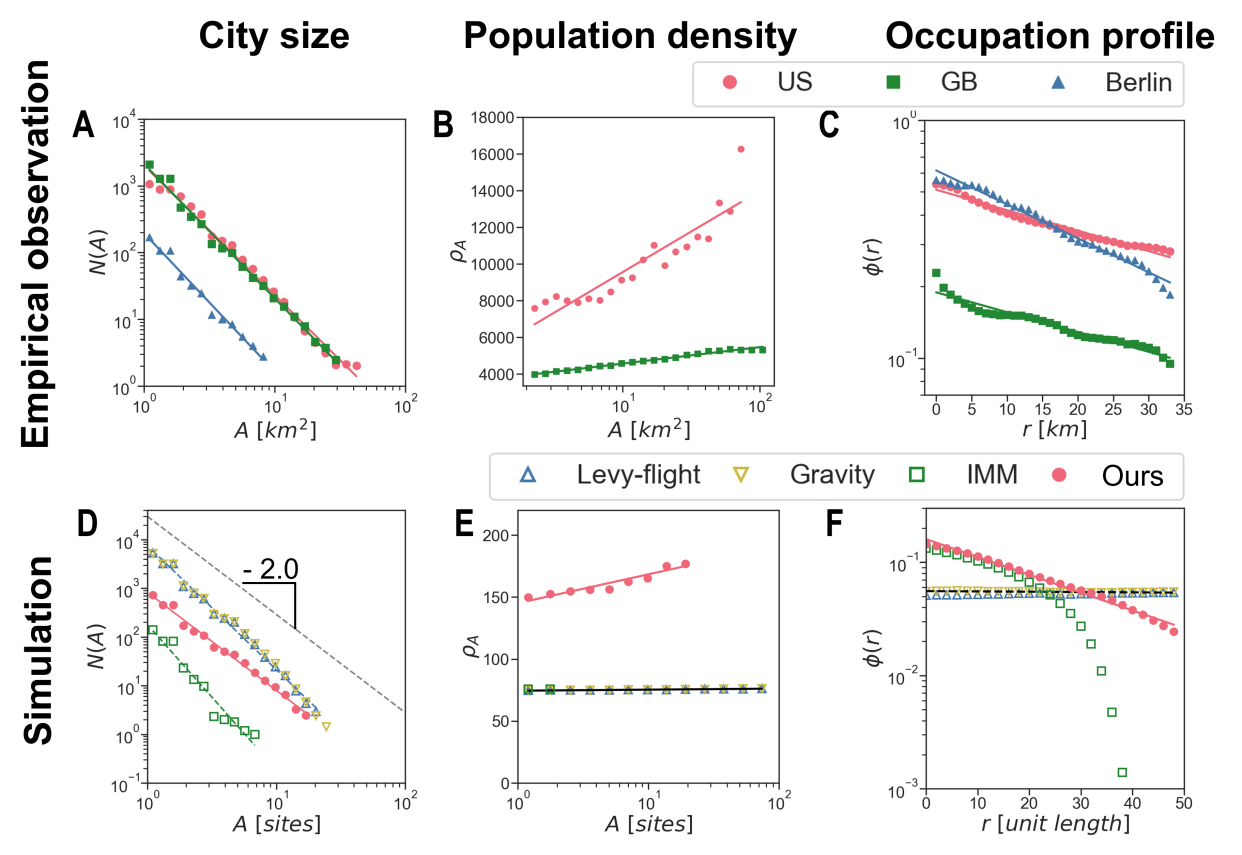 (A-C)美国、英国和柏林区域的城市演化规律:A 城市面积分布,B 城市人口密度与城市面积关系,C 城市人口密度分布。(D-E)不同人类移动模型预测的城市演化规律:D 城市面积分布,E 城市人口密度与城市面积关系,F 城市人口密度分布。