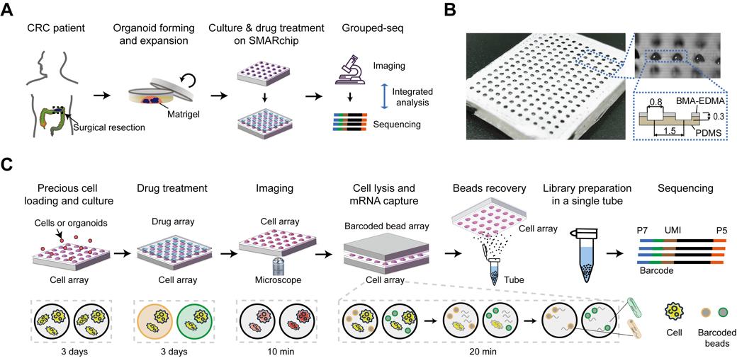 图1.Grouped-seq概念及其基于超疏水微孔阵列芯片的分析流程