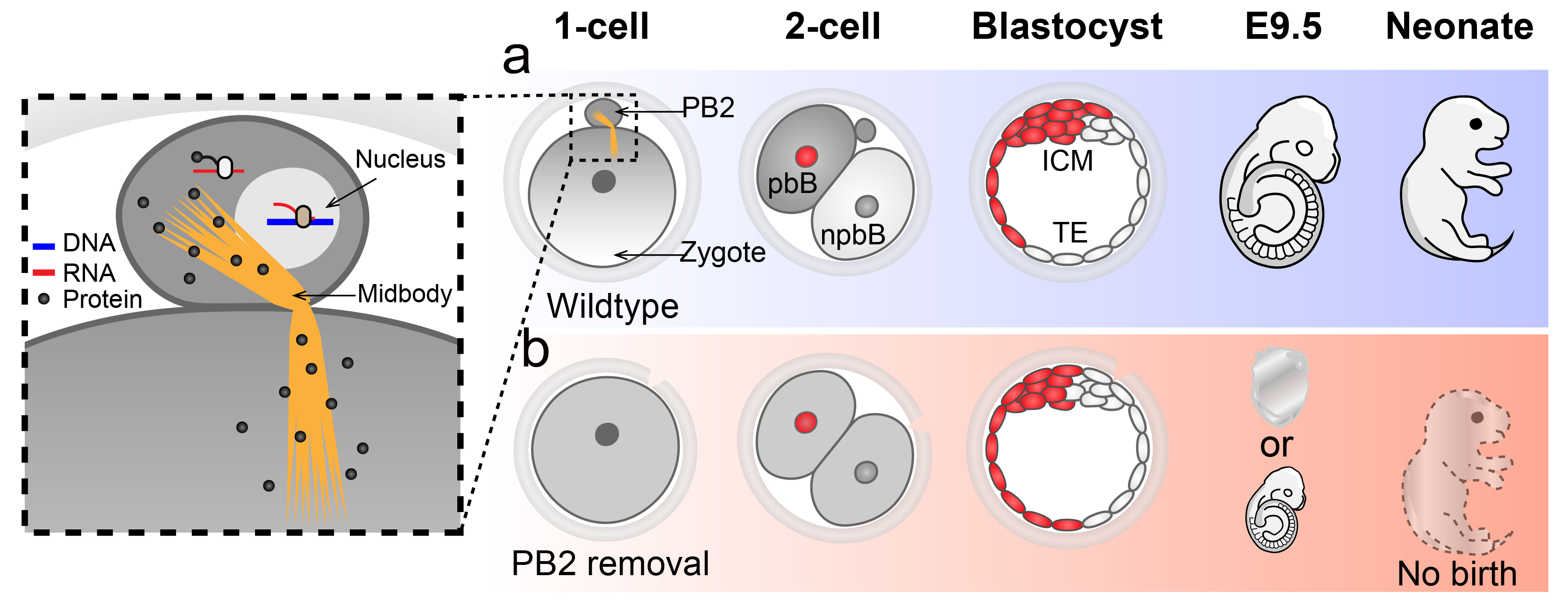 a.正常小鼠受精卵的第二极体(PB2)中由mRNA翻译出的蛋白可以转运到合子中,很可能形成浓度梯度,从而导致两个子细胞得到的蛋白量不同,产生发育命运的差异,其中pbB的后代细胞对ICM的贡献更大,在子宫着床后可正常发育并出生。