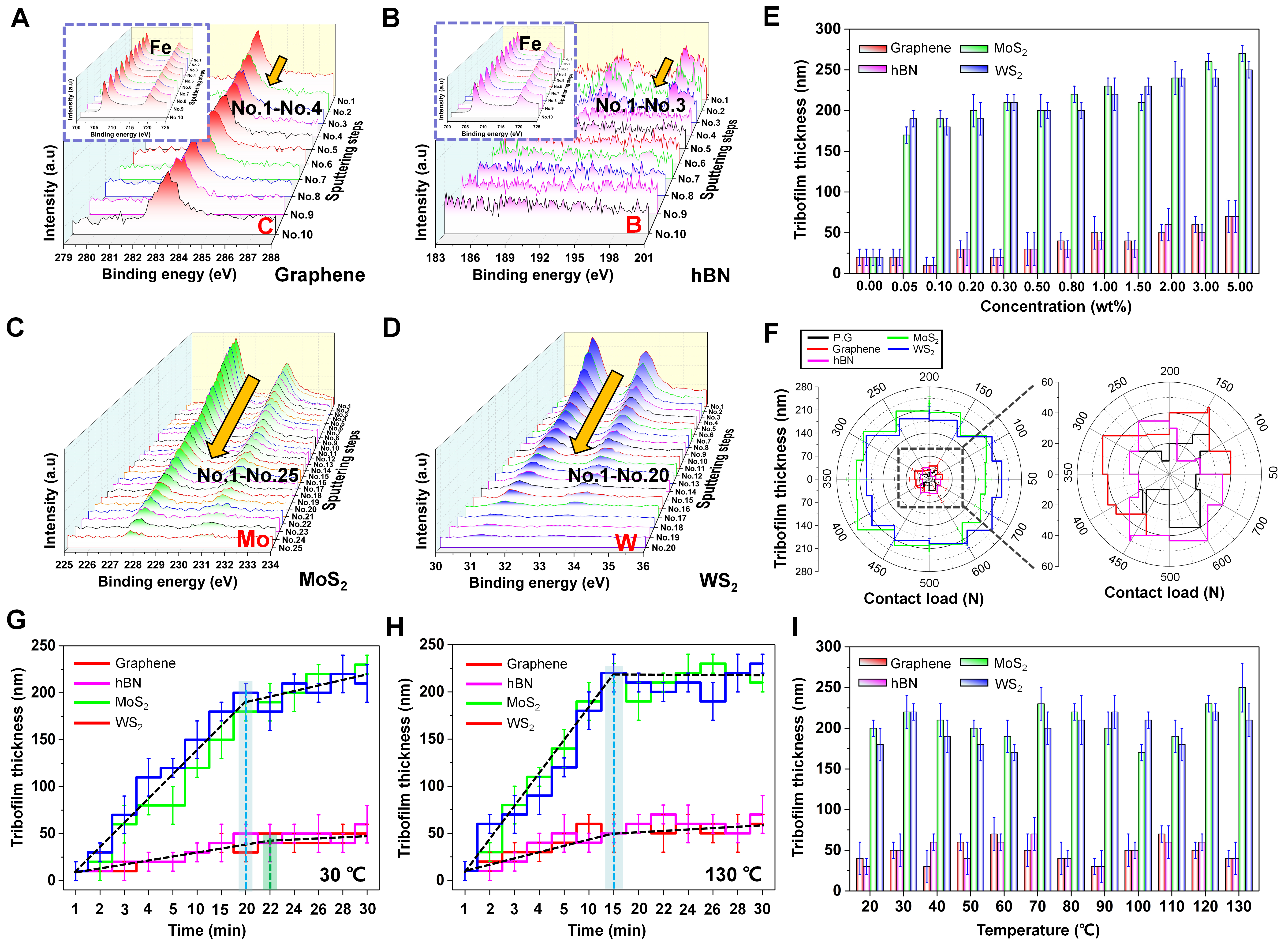 液体润滑界面的摩擦域主要有边界润滑膜和动压润滑膜组成,两种膜的耦合作用主导了界面的抗摩擦和抗磨损性能。研究发现,二硫化钼和二硫化钨的边界润滑膜厚度大约为200-250纳米;而石墨烯和六方氮化硼的边界润滑膜厚度大约为30-60纳米。尽管二硫化钼和二硫化钨的摩擦系数较高,但超高鲁棒性的边界润滑膜保证了其具有优越的抗磨损性能。在机械应力和摩擦热的诱导下,二硫化钼和二硫化钨纳米片层在润滑界面发生摩擦化学反应。硫原子与摩擦界面铁原子之间形成共价键,产生铁的硫化物和铁的硫酸盐,极大增强二硫化钼和二硫化钨纳米片层在界面的粘附特性,由此增强摩擦界面边界润滑膜的鲁棒性。