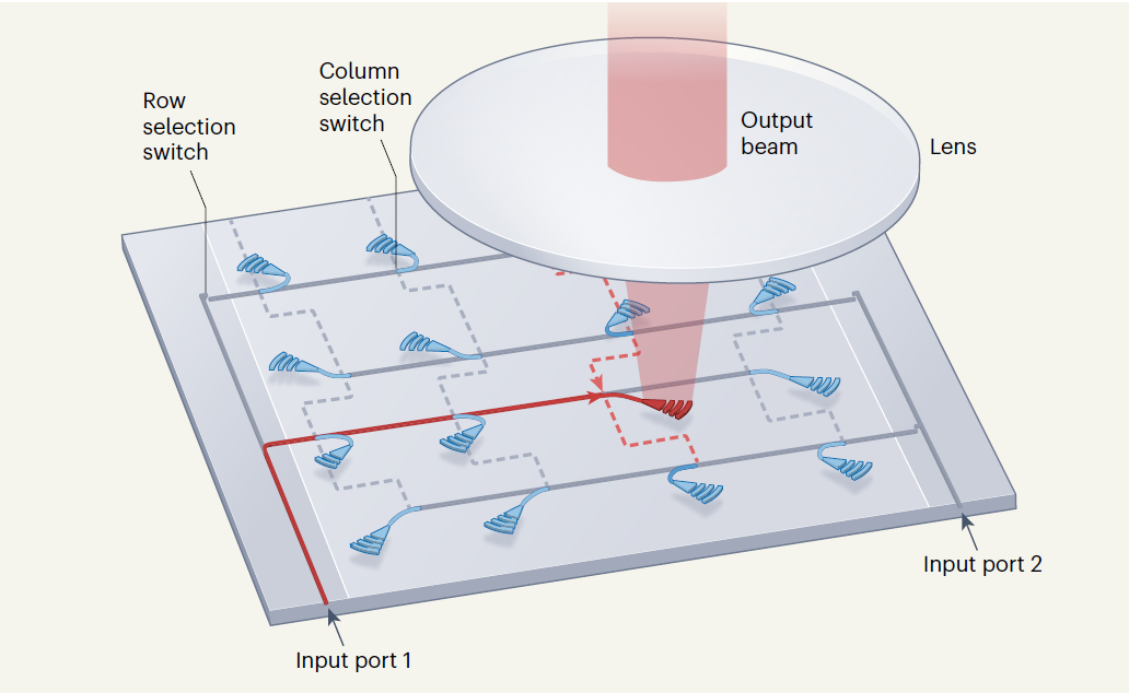 该文章主要对比分析了目前两种用于片上激光雷达的集成波束调控器件,光学相控阵和焦平面开关阵列。文章分析了光学相控阵列的工作机理,并指出了导致其难以大规模密集集成在单颗芯片上的原因。相比之下,焦平面开关阵列使用一个类似相机的光学系统,将目标物所在视场内的每个角度映射到成像透镜后焦平面的每像素上。基于焦平面开关阵列无需单独控制每个像素的相位,而是使用开关来控制每个像素的开合这一特性,文章提出该方案可在单个芯片上实现集成大阵列天线的可能性。文章进一步评论了美国加州伯克利大学Ming C. Wu课题组发表于同期《自然》(Nature)的基于MEMS的大规模焦平面开关阵列激光雷达系统的工作,对其进行了总结和评价。文章积极肯定了128*128像素的天线阵列安装在一个只有指尖大小的芯片上这一重大成果,同时强调了该激光雷达系统的70°×70°的大视场角和16,384的高成像像素的优异性能。除此之外,文章提出受益于MEMS硅光开关控制天线的快速响应时间与微小尺寸,该系统可具有0.6°的双向寻址分辨率、0.05°的光束发散角和亚兆赫兹的操作速度的随机寻址光束转向等出众性能。系统结合了调频连续波测距方法,可以实现距离分辨率为1.7cm的3D成像。文章还结合实际应用场景提出了焦平面开关阵列集成激光雷达系统横向分辨率不足的问题,并给出了通过缩小光学开关尺寸来提升性能的解决方案。最后,文章评价焦平面开关阵列可以在互补金属氧化物半导体(CMOS)代工厂大规模生产,具有很大潜力,尤其在百万像素三维激光雷达和光通信等应用前景广阔。