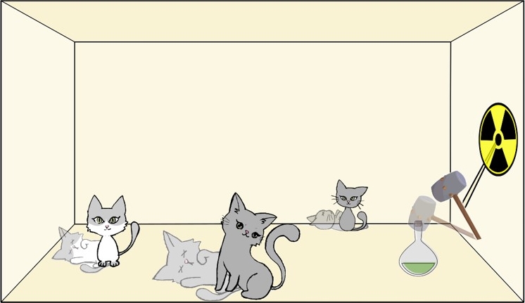1935年,物理学家薛定谔(Erwin Schrödinger)为了阐述量子力学中的悖论,提出了一个著名的思想实验。根据薛定谔的想法,原子可能同时以两种不同的状态存在,这称作量子叠加,如果在原子和宏观物体间产生相互作用,将它们“纠缠”起来,这时宏观物体可能处于一种奇怪的叠加态。薛定谔用一只猫来说明这种情况,设想一个封闭的房间里有一只猫和一瓶毒药,如果原子的衰变能够触发机械装置打破瓶子、释放毒药,那么猫必死无疑。但考虑到原子可能处在衰变或者未发生衰变的叠加态,这意味着房间里可能存在一只“又死又活”猫,即著名的“薛定谔的猫”。