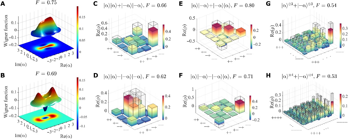 此项工作的理论基础是段路明教授与其合作者提出的Duan-Kimble可扩展光量子计算方案,该方案借助腔电动力学体系实现了飞行光量子和原子之间的量子纠缠。在本实验中,研究人员利用相位相反的相干态飞行微波光子模拟猫的“生”和“死”,借助飞行微波光子在包含超导量子比特的谐振腔端口的反射过程实现超导量子比特和相干态微波光子的量子纠缠,即“薛定谔猫”态的制备;通过连续反射多个相干态微波光子脉冲实现了多体“薛定谔猫”态(multipartite Schrödinger’s cat state)的制备。如图2所示,研究人员在高维度的希尔伯特空间中利用量子态层析方法重构飞行微波光子的量子态,确认了直到四体“猫”态的成功制备。研究人员从多体飞行微波光子态的密度矩阵出发,利用可局域量子纠缠的方法验证了直到四体“猫”态中的量子纠缠,这也是实验中首次成功制备超过两体的半经典态之间的量子纠缠。此外,通过重构超导量子比特和多体“猫”态这个混合量子系统的密度矩阵,研究人员确认了这两种本质上截然不同的量子态之间的量子纠缠。