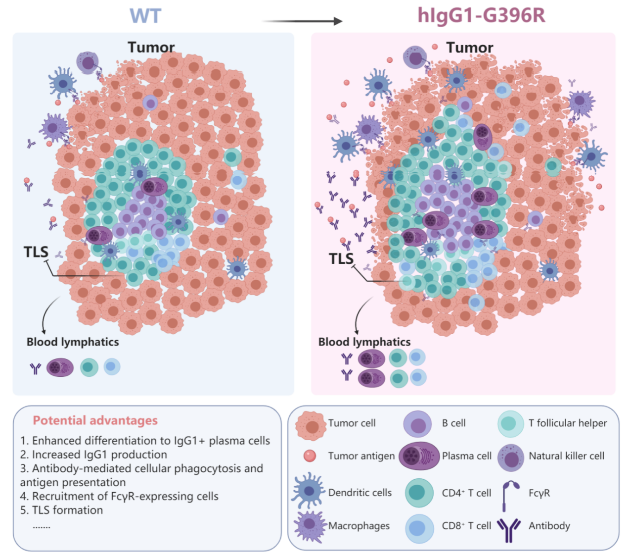 通过与北京大学张泽民教授和张雷博士合作进行结直肠癌肿瘤组织的单细胞转录分析发现hIgG1-G396R纯合基因型患者的肿瘤微环境中,IgG+浆细胞、CXCR5+滤泡辅助T细胞、CXCR6+活化型辅助T细胞、CD6+肿瘤驻留性CD8+T细胞和CD160+上皮内CD8+T细胞都得到了上调,而Treg细胞和LAYN+耗竭性CD8+T细胞呈现下调。前述结果证明hIgG1-G396R不仅影响了肿瘤组织中浆细胞的分化和肿瘤特异性抗体的产生,还通过改变肿瘤患者的免疫微环境,从而增强癌组织微环境中的整体性抗肿瘤免疫力。