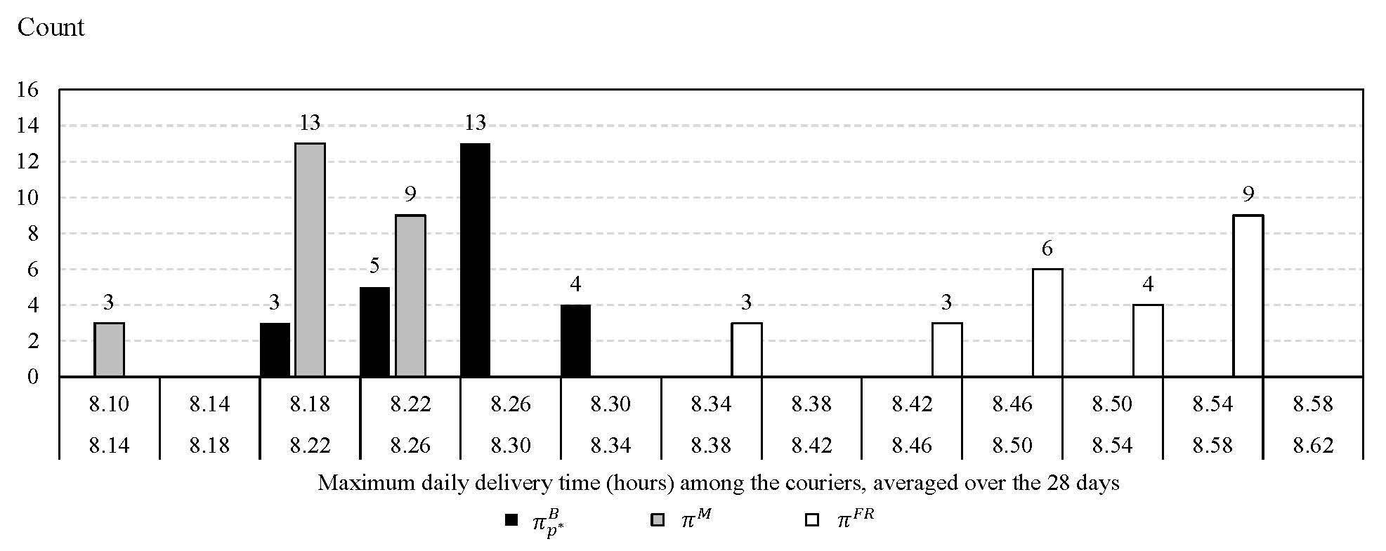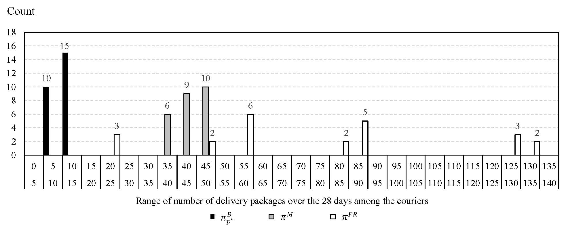 关于最后一公里城市配送中的配送员工作量平衡(workload balance)的论文考虑配送员工作量平衡的最后一公里城市配送任务分派问题。论文首次明确区分激励型(incentive)和负荷型(effort)任务量,分别对应配送员的收入与工作时长,并考虑两种类型的任务量平衡期的差异。具体而言,负荷型任务量(工作时长)按天或班次平衡,而激励型任务量(收入)按工资周期平衡。考虑到工资周期内每日配送订单的随机性,论文建立了马尔可夫决策过程模型,推导了最优目标函数值的理论下界,并设计了基于成本函数近似(cost function approximation,CFA)的平衡惩罚策略。数值实验展示了该策略相对于四种对标策略的优势,并展示了该策略在需求波动下的鲁棒性。图3.展示了不同配送任务分派策略下的两种任务量不平衡度的对比。