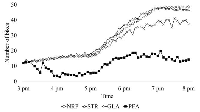 图2 不同单车动态调度策略下不同节点的单车数量随时间的变化