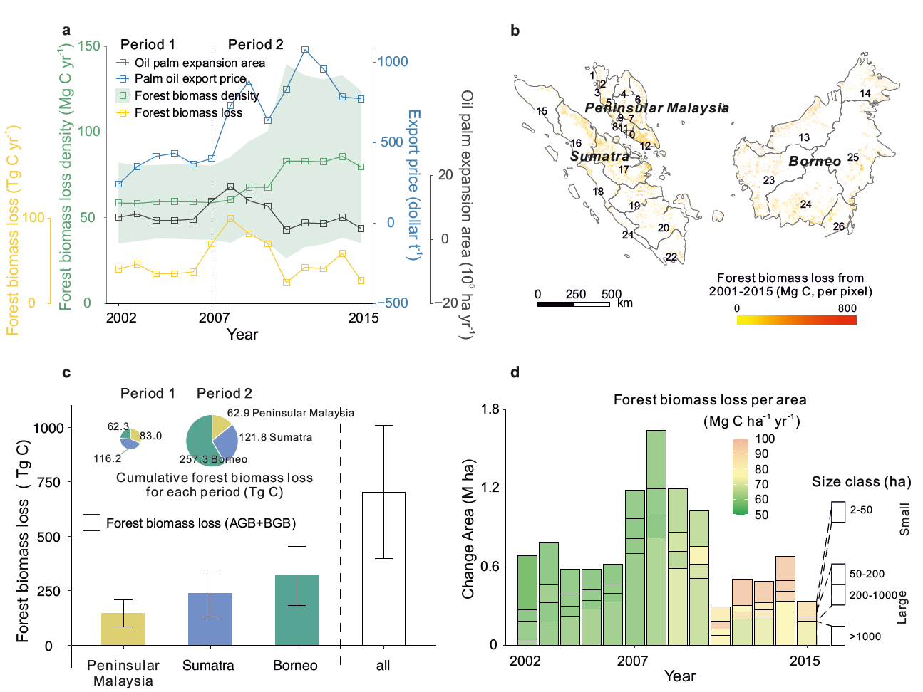 2001-2015年期间,研究区油棕向森林扩张造成了每年50.2±21.9 TgC的森林生物量损失(图1)。其中,大型工业油棕种植园的面积扩张及造成的碳损失总量最高。如果综合考虑油棕种植园扩张造成的森林生物量损失、油棕生长带来的生物量增加、油棕扩张造成的边缘森林的生物量减少以及扩张前后的土壤碳损失等多种因素,研究时间段内的总碳损失高达1063.7±409.6 TgC。2001-2015年间,油棕种植园的土地利用转化来源更多来自次生林而非传统估算方法中使用的原生林。2007年后,油棕种植园逐渐从侵占碳密度较低的森林转向侵占碳密度较高的森林。这种变化趋势在以小农为主的小型油棕种植园中最为明显(图1d)。