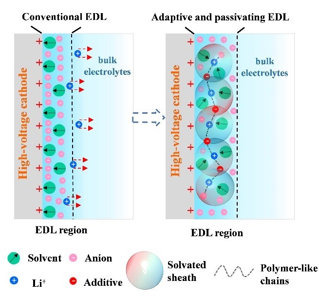 首页网4月20日电 近日,化工系刘凯课题组通过对电解液的分子间作用力调控,突破了常规双电层结构的束缚,在低温快充锂金属电池方面取得重要进展。通过在电解液中加入新颖的“电压刺激响应添加剂”,在充电过程中,其可自发迁移到正极/电解液界面上,并选择性地与阳离子和游离溶剂结合,可以在双电层(EDL)内层形成独特的富含阳离子和支链状的超分子聚合物结构,构筑了一种独特新颖的“富锂离子-贫溶剂”双电层,其具有自适应和钝化特性,显著降低了醚基电解液在高电压正极表面的分解,由此,电池表现出优异的性能,例如超快速充放电和超低温应用,这在传统电解液设计中是很困难的。非常规的EDL结构打破了对经典EDL重排机制的固有认知,极大地提高了器件的电化学性能。