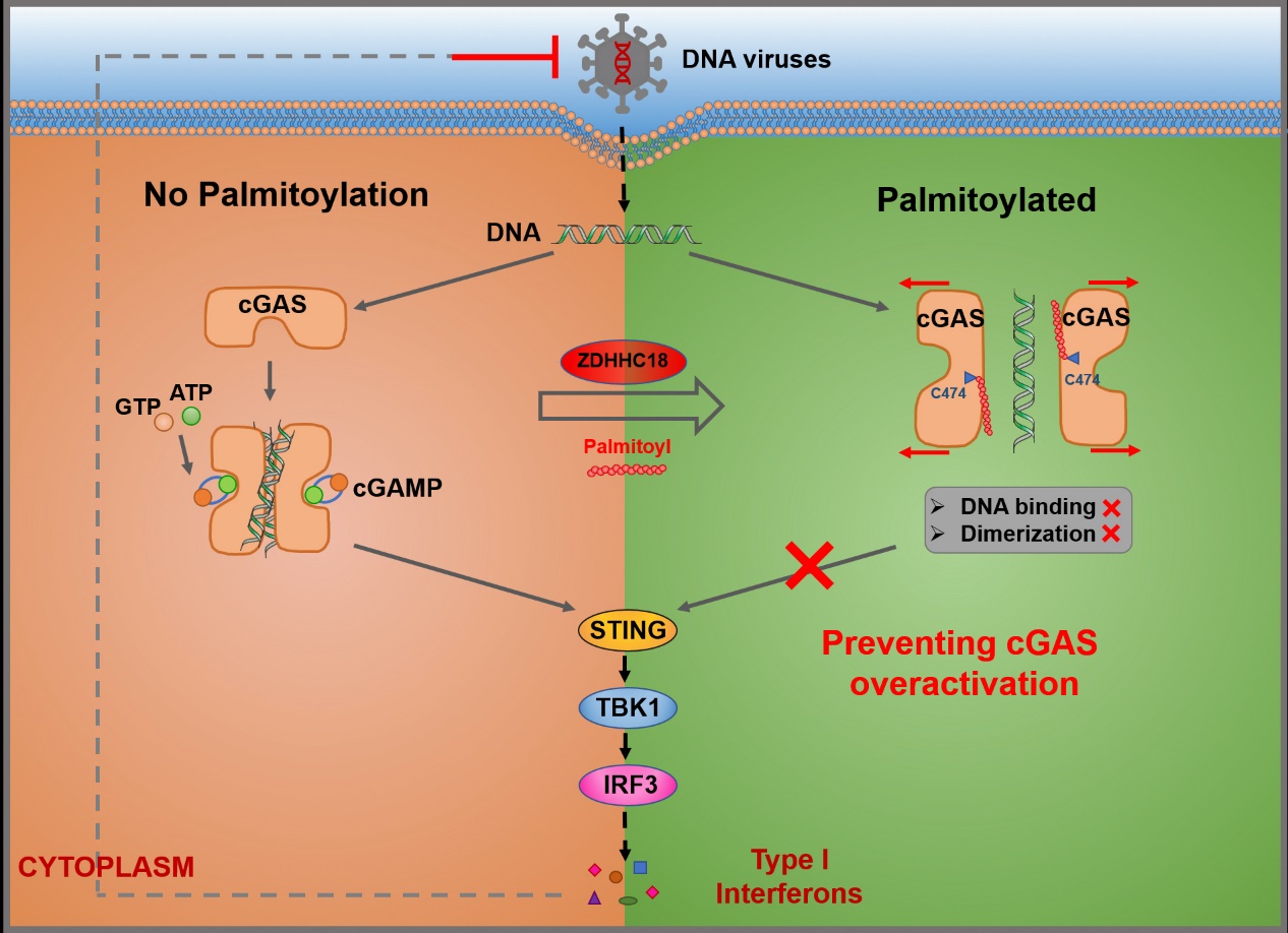 环状鸟苷酸-腺苷酸合成酶(cGAS)由美国德州大学西南医学中心的陈志坚教授在2013年发现,近年已经成为天然免疫领域的研究热点。cGAS可识别病原体双链DNA分子,是启动抗病毒天然免疫防御的重要“哨兵”之一。除了抗病毒感染,cGAS介导天然免疫信号通路还在肿瘤免疫和自身炎症等疾病发生中发挥重要功能。cGAS功能缺陷或异常激活均会使机体免疫平衡失调,造成病毒感染或自身免疫性疾病的发生。因此,对cGAS功能调控的机制探索具有重要意义。棕榈酰化是蛋白质翻译后修饰的重要形式之一,它指将长链脂肪酸共价连接至蛋白质半胱氨酸侧链巯基上,可调节蛋白的亚细胞定位和酶活性等方面。棕榈酰化修饰是否参与调控cGAS的功能尚不明确。