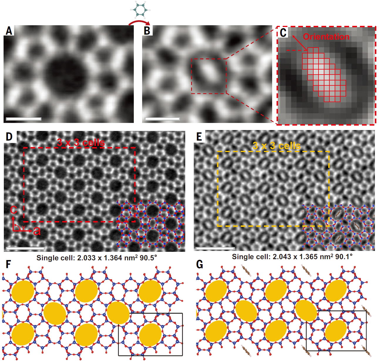 魏飞团队利用表面原子级平整ZSM-5分子筛的通透直孔道作为成像窗口,以苯分子为探针,研究了苯分子在ZSM-5中的动态吸脱附行为和对应的分子筛孔道结构演变过程。实验发现,苯分子进入孔道后,在空间限域作用下采用一致的取向排列,呈现一维类固体的存在形式,在孔道投影方向表现为纺锤体形状,并非分子动力学所假设的对称球形。首次观察到分子筛在限域苯分子作用下表现出“刚柔并济”的亚单胞拓扑柔性结构特点——其单个孔道沿限域苯分子的长轴方向可发生15%的最大形变,以允许比晶体学孔径(0.56 nm)更大的苯分子(0.585 nm)进出;同时,MFI结构独特的Pnma空间群对称性使得相邻孔道发生相反方向的形变,相互抵消,使得整个晶胞的结构维持刚性,单胞尺寸(~2 nm)变化小于0.5%(图3)。