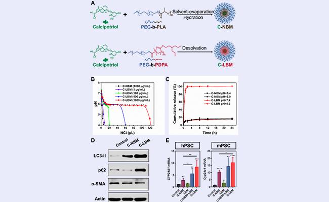为实现协同的自噬抑制和VDR信号通路激活,该研究以具有精准、强效pH缓冲作用的LBM为自噬抑制剂,通过LBM包载VDR配体Cal,构建了C-LBM(图3A)。C-LBM保留了LBM精准、强效的pH缓冲作用(图3B),并能够响应酸性溶液环境快速释放Cal(图3C)。更重要的是,在活化的PSC中,C-LBM同样高效抑制了自噬并逆转了p62的丢失(图3D),实现了增强的VDR信号通路激活(图3E)。该部分是研究的制剂基础,递送系统的合理设计使得从药学角度对协同重塑PSC策略的评估成为可能。