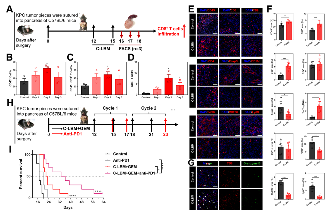 免疫疗法引发了抗癌新一轮变革,为评估协同重塑策略对免疫疗法的影响,该研究构建了同样具有复杂、免疫抑制性微环境的KPC同种移植瘤模型。C-LBM显著促进了CD8+T细胞的浸润。更重要的是C-LBM显著提高了PDAC对免疫疗法的响应性,C-LBM联合anti-PD1、GEM也将患癌小鼠的生存期提升了2倍(图6)。
