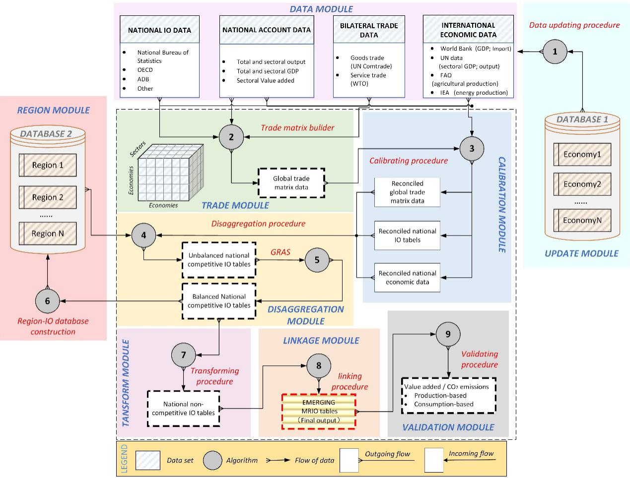 针对上述问题,心博在线登录入口地学系关大博教授研究组联合伦敦大学学院、挪威科技大学、格罗宁根大学和上海财经大学等多家机构学者,创新多源数据融合方法,构建了模块化的全球全区域投入产出模型编制框架(EMERGING MRIO)。EMERGING MRIO是由中国学者领衔研发、具备完全自主知识产权、聚焦于新兴经济体的全球全区域投入产出数据库。与现有数据库相比,EMERGING数据库具有以下5个特点:1.国家分辨率高,全面覆盖了全球所有经济体的经济与贸易信息;2.行业分辨率高,全面反应制造业及服务业供应链的结构变化特征;3.时间覆盖范围广,覆盖了2010年以来的多个历史年份;4.近实时更新,能够反映最新的贸易变化及政策影响;5.采用模块化编译流程,各个模块之间互不影响,减少了各步骤之间的耦合过程,提高了编译效率。